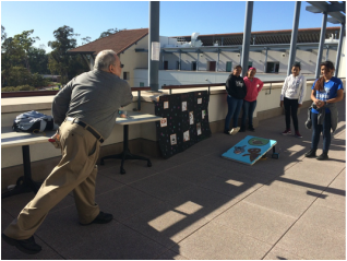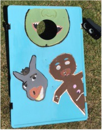The Interactive Bean Bag Toss was a faire game that MakerSpace youth created in order to run booths at Isla Vista’s Children’s Day as well as the UCSB GGSE Maker Faire. Students first prototyped the game using LittleBits electronic legos, then transitioned to a pre-made bean bag stand, where they drew, painted, added conductive materials, and drilled screws into it. The circuits used a “plug and play” microprocessor and conductive ink. People threw bean bags at the characters painted on the stand, triggering a selected soundbite when the conductive fabric made contact with the conductive paint. Visitors were encouraged to throw bean bags to trigger programmed sounds, such as Shrek the ogre yelling “Get out of my swamp!” Finally, the students made a poster to explain capacitive sensing and conductivity, and posted "how-to" guide on Instructables.